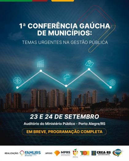 Com o objetivo de fortalecer o diálogo, a capacitação e a busca por soluções conjuntas para os desafios da administração local, a Famurs promove a 1ª Conferência Gaúcha de Municípios: Temas urgentes na gestão pública. O encontro será realizado nos dias 23 e 24 de setembro, no auditório do Ministério Público, em Porto Alegre, reunindo prefeitos(as), vice-prefeitos(as), secretários(as) e servidores municipais.